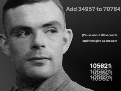 在《计算机器与智能》的一段里面,图灵模拟量对想象中未来的智能计算机测试可能的样子。(人提出问题,计算机回答)