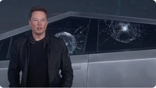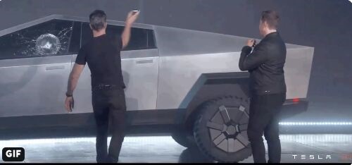 很快他就要笑不出来了。特斯拉设计总监弗朗茨·冯·霍兆森(Franz von Holzhausen)拿着金属球上场了,扔向皮卡侧面车玻璃后,马斯克所宣称的牢不可破的金属玻璃应声而碎,场面十分尴尬。