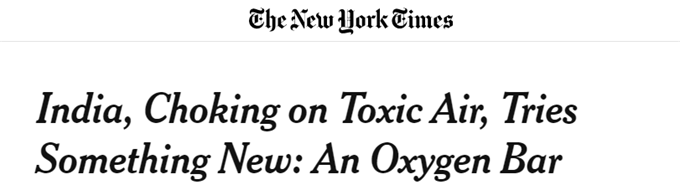 《纽约时报》最近报道,由于印度空气污染水平飙升到历史新高,一家叫做Oxy Pure的氧吧已经开始向公众兜售新鲜、清洁的氧气,吸15分钟收费20-40元不等。