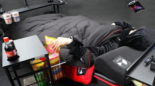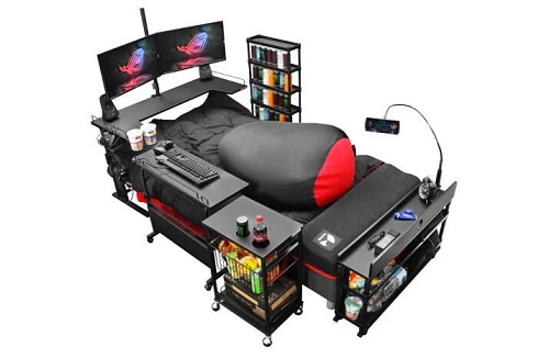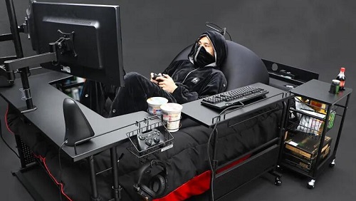 你需要考虑游戏电脑或游戏机、显示器的成本,以及你认为在床上可以安全食用的任何食物,但如果在这里实施强制性的冠状病毒隔离,这似乎确实是一个消磨时间的好方法。唯一缺少的是一个内置的床罩——真是一个大疏忽。一旦你在这个平台上安顿下来,周围都是你需要的东西,谁会想离开这里去上厕所呢?也许那就是那些超大的方便面杯子的用途。