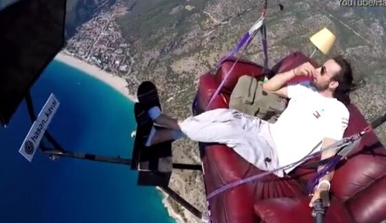 上周,哈桑·卡瓦尔在他的滑翔伞上安装了沙发和电视。然后从悬崖上起飞,同时用相机记录下了整个过程。