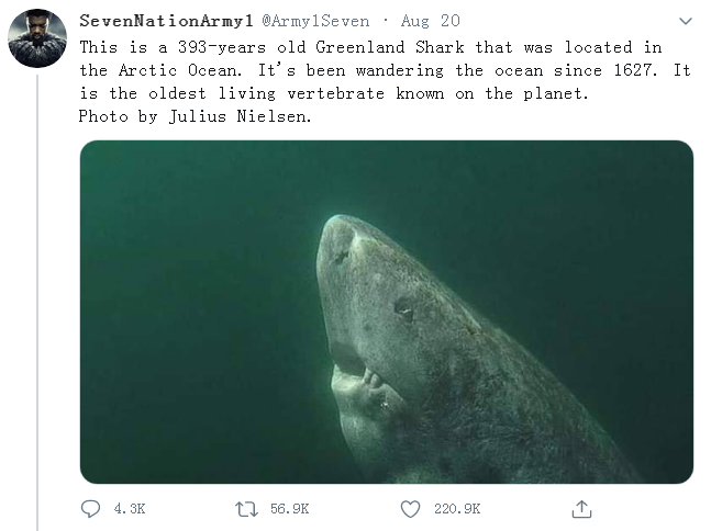 “最近,社交媒体都对这只长寿的格陵兰睡鲨非常疯狂……所有这些都是从2016年8月开始传来的同一个故事,请注意,我们还没有发现任何鲨鱼寿命达600或500年……。 我们已经估计(尚未验证)一只鲨鱼的年龄至少为272岁,或更详细地讲,该鲨鱼的年龄为272-512岁之间,并且具有95.5%的确定性(后者也是未经验证的估计)。”