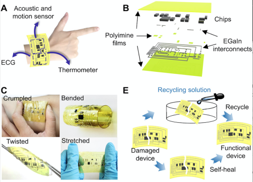 当电子皮肤浸入回收溶液后,聚亚胺材料会很快降解,而电子零件则沉入溶液底部。