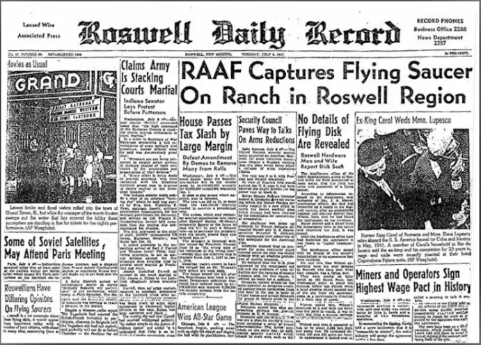 1947年7月8日,美国新墨西哥州罗斯威尔的《每日新闻报》刊出一条“耸人听闻”的消息:“空军在罗斯威尔发现坠落的飞碟。”据称,该消息是由基地司令朗查德上校签发的。随后,这条新闻立即被《纽约时报》等各大报刊转载,无线电波载讯传遍世界。