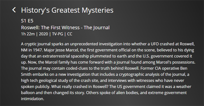 12月12日起,英国《历史频道》三集系列节目《罗斯威尔:第一证人》开播。在该节目中,杰西·马塞尔少校--也就是1947年调查罗斯威尔残骸的情报部门负责人--的私人日记首次公开,日记称在现场收集的金属残骸是“不可摧毁的碎片,不是由人类制造”。