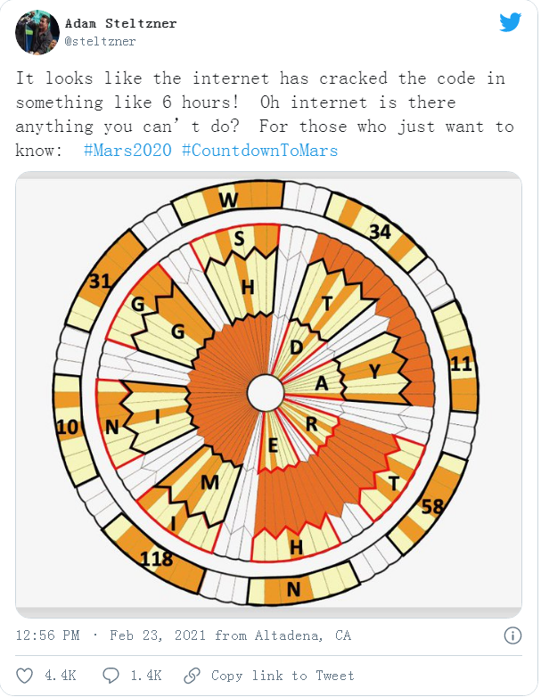 “毅力”号的总工程师Adam Steltzner在推特上透露,这些条纹从降落伞的中心放射出看似随机的同心圆图案,实际上是用二进制代码写的一条信息。每一串红白条纹代表一个字母;从降落伞最里面的环到最外面的环按顺时针方向读,编码的字母拼出了这样的信息: