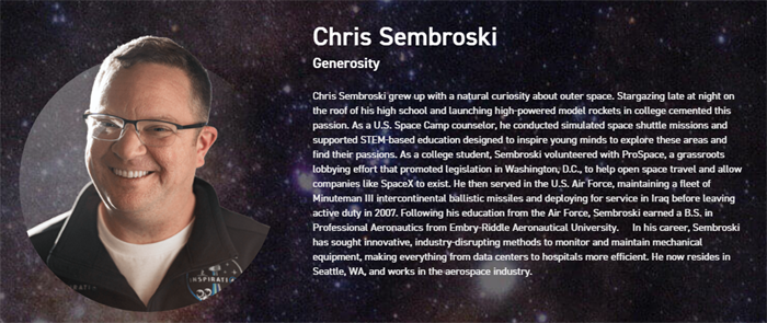最后一个席位授予了现年41岁的Sembroski,他捐赠并参加了彩票活动,但本月初并未在随机抽签中被选中——中奖的是他的朋友。 他的朋友出于个人原因拒绝飞行,并把名额转让给了Sembroski,因为他曾在大学担任过太空营的顾问,并自愿参加了太空倡导团体。