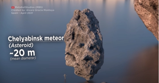 该视频显示,最小的是一颗在2013年2月15日撞击了俄罗斯车里雅宾斯克地区的一颗小行星,长约20米。但是它造成的破坏却很严重,大约1500人在事故中受伤,7,00栋建筑物受损。