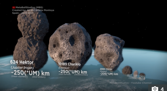 与之相比,视频中展示的最大的小行星是位于特洛依群小行星中的赫克特(Hektor),跨度长达250公里: