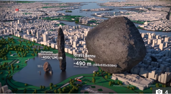 此前有人认为是外星飞船的Oumuamua小行星也有出镜,长约400米。而被NASA的OSIRIS-Rex探测器光顾过的小行星本努也出现在视频中,作者将其“放置”在纽约中央公园,以便更直观地看出其大小: