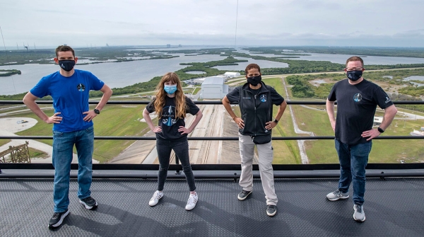 (在2021年3月29日星期一的这张照片左起,Jared Isaacman,Hayley Arceneaux,Sian Proctor和Chris Sembroski在佛罗里达州卡纳维拉尔角的NASA肯尼迪航天中心的SpaceX发射塔上合影。)