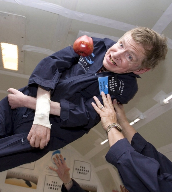 有趣的是,舱内与霍金一起飘浮的还有一个红红的大苹果。据说,伟大的物理学家牛顿300年前就是受一个落地的苹果的启发而顿悟了万有引力定律。虽然这个广为流传的故事的真实性经常遭到质疑,但也让科学史更有趣味。既然牛顿无缘体会失重的滋味,就用苹果向大师表达敬意。