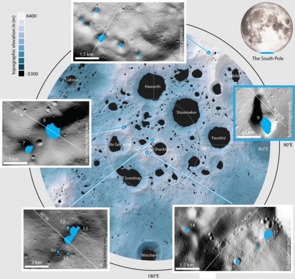 *新研究的17个陨石坑和洼地位于南极附近。这些区域中最小的(区域11)只有0.18平方公里,而最大的(区域9)只有54平方公里。区域9不位于这里所显示的南极区域,而是位于薛定谔盆地。这里显示的月球表面的表示是基于来自月球侦察轨道飞行器的高度计数据。图片来源:©MPS/牛津大学/NASA艾姆斯研究中心/FDL/SETI研究所