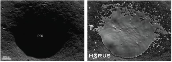 *月球南极地区一个尚未命名的陨石坑。它位于莱布尼茨高原,接近美国宇航局挥发物极地探索车(VIPER)的目标任务区域。左图是月球勘测轨道飞行器拍摄的照片。陨石坑的内部几乎看不见。右图为HORUS机器学习算法处理后的图像。左图:NASA/LROC/GSFC/ASU;右:MPS/牛津大学/NASA艾姆斯研究中心/FDL/SETI研究所