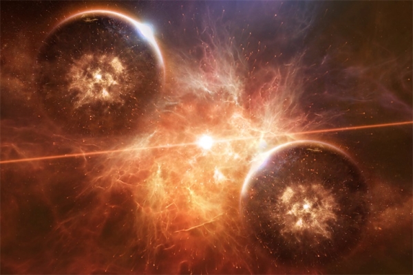 2017年,美国和意大利的引力波天文台LIGO和 Virgo首次观测到了中子星碰撞形成重金属。 在来自距离地球1.3亿光年的宇宙深处,两颗中子星碰撞产生了大量的黄金——数量相当于地球质量的几倍!数学表明,与超新星爆炸相比,双中子星碰撞是一种更有效的产生重元素的方式。