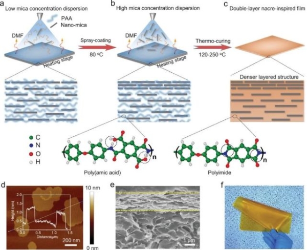 区别于以往仿珍珠层纳米复合膜的单层结构设计,在该项研究中,研究人员通过改变组分配比,借助喷涂与热固化联用法构筑了具有双层类珍珠层结构的聚酰亚胺-云母纳米复合膜,使其顶层具有更致密的云母纳米片(如下图1a-f)。