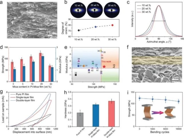 研究人员利用前期开发的具有优异力学性能和紫外屏蔽功能,而且可宏量制备的云母纳米片(Nat. Commun. 2018, 9, 2974)作为构筑基元,与聚酰亚胺前驱体共组装,得到聚酰亚胺-云母纳米复合膜,利用云母的优越本征特性来弥补聚酰亚胺的不足。