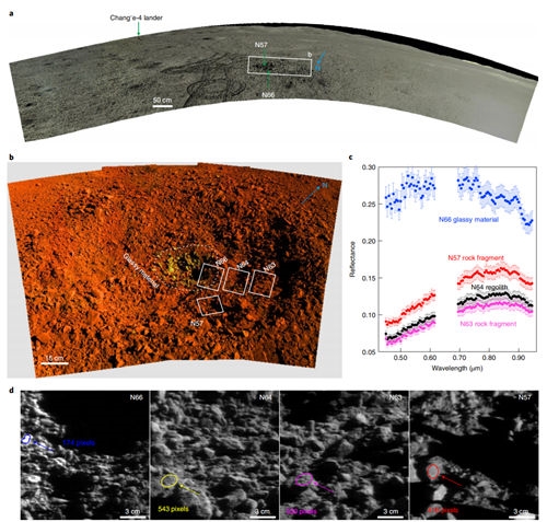 基于全景相机近距离获取的撞击坑影像,团队发现,撞击坑中心存在一些与坑壁及坑外月壤明显不同的物质(图1b)。