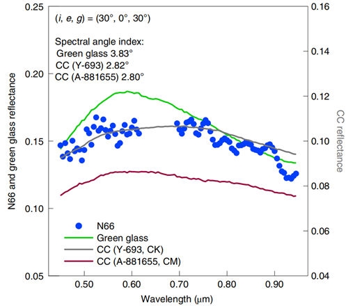 由此,刘洋团队推测,可能是存在某种具有蓝化光谱特征的外来撞击体物质混入了其中,因为在小行星中,只有碳质小行星的光谱存在蓝化特征,于是搜集了大量碳质球粒陨石的光谱。