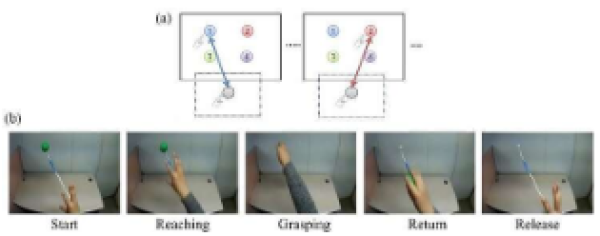 在运动任务中,参与者被给予视觉提示,或者通过在他们面前放置一个真实的网球,或者通过虚拟现实耳机以第一人称视角显示人类手臂向前伸的片段。他们被要求向前伸手,抓住一个物体,然后把手收回并释放物体,同时在手腕和手指上佩戴运动传感器。在第二项任务中,他们被要求想象在不移动手臂的情况下向前伸手。