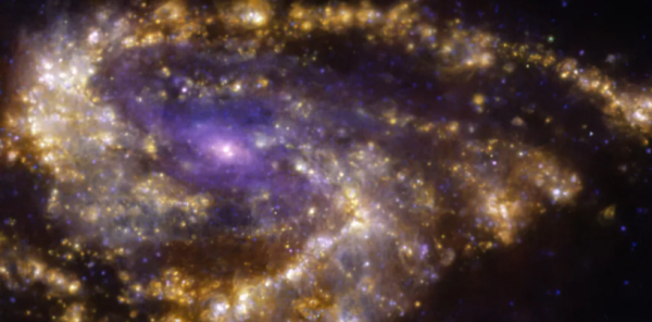 在这张由欧洲南方天文台(ESO)发布的新图像中,宇宙中独特的螺旋星系——梅西耶66号星系(M66)正辐射出金色和紫色气体。