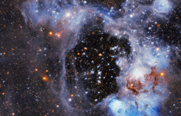 这幅图像使用了宇宙独一无二的调色板:蓝色代表电离氧,红色代表氢,橙色代表硫。因为恒星是在气体云中诞生的,分析恒星形成的一个行之有效的方法就是观察星系中的气体。