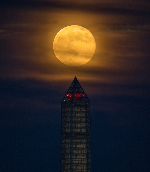 * 2013年6月23日,在美国华盛顿特区,一颗超级月亮爬到了华盛顿纪念碑的顶端
