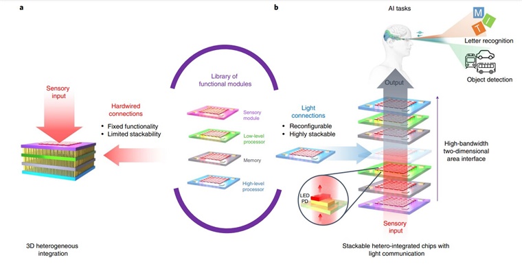 研究人员称,这种类似乐高积木的芯片设计包含两层,一层是交替式的传感层,另一层是用于芯片进行光学通信的发光二极管层。而芯片间可以自由配置、交换、堆叠,也可以天价新的传感器和处理器。