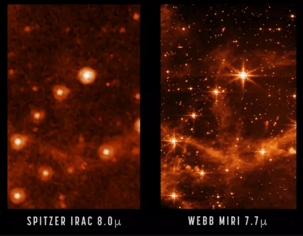 * 美国宇航局退役的斯皮策太空望远镜和詹姆斯·韦伯太空望远镜对天空同一部分的观测结果对比