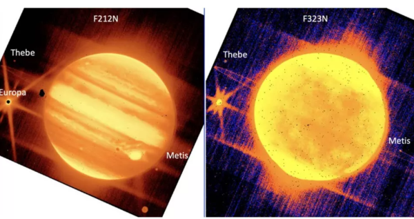 * 左:通过詹姆斯·韦伯太空望远镜的NIRCam仪器2.12微米滤光片可以看到木星和它的卫星木卫二、底比和梅蒂斯;右:通过NIRCam的3.23微米滤光镜拍摄的木星、木卫二、底比和梅蒂斯。