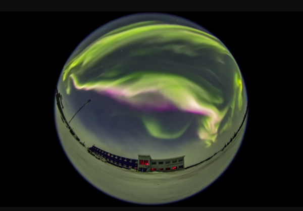 * 2018年2月16日,鱼眼镜头拍摄的全天空极光