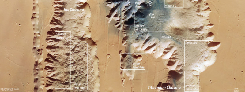 有趣的是,“火星快车号”在Tithonium峡谷的一些特征中检测到了含硫酸盐的矿物质。这被解释为峡谷曾经(至少某部分)充满水的证据。