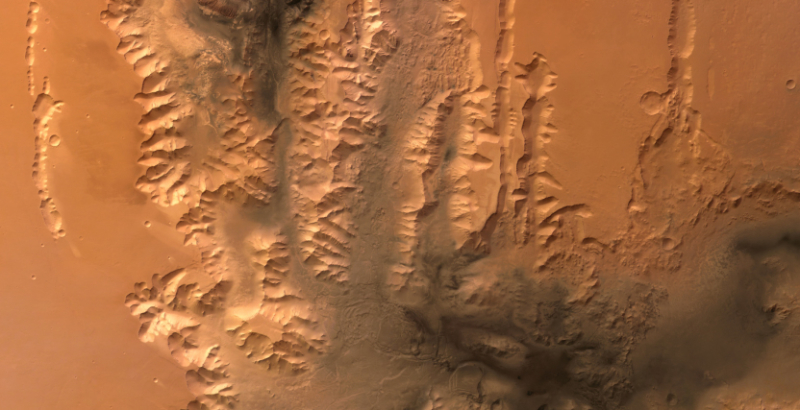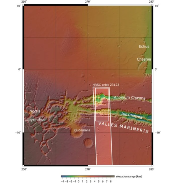 火星快车号发回的图像使该峡谷看起来相对较浅,但这两个坑大得令人难以置信:全分辨率版本大约是每像素25公里。Ius峡谷全长840公里,Tithonium峡谷全长805公里。