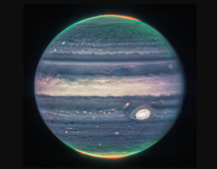 * 韦布的NIRCam拍摄的木星合成图像,两极周围的橙色辉光就是极光(图片来源:NASA、ESA、CSA、Jupiter ERS)