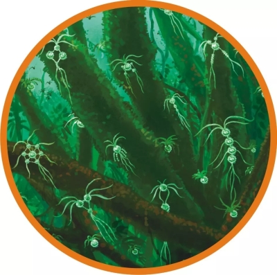 林间的半空中,一些绿色的小球体顺着微风,忽上忽下地飘浮着。这是飞蒲,植物星球上最常见的小型物种。