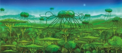 然而,并非所有舞动于天际的生灵都如同飞蒲这般娇小可爱。天空中缓缓飘来大片“云彩”,向着大地投下了“沉重的阴影”。风中瑟瑟的枝叶仿佛感受到这一来自天空的威胁,无助地颤抖起来。“云彩”平稳而缓慢地下降着,竟是一株巨大的怪异植物!