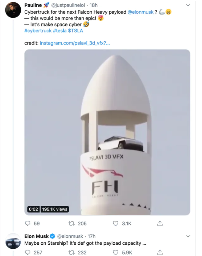美国时间周二,推特用户@justpaulinelol分享了一段SpaceX火箭发射一辆Cybertruck的短视频,同时@马斯克:Cybertruck将搭乘新一代猎鹰重型火箭升空?