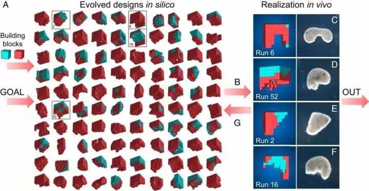 如果用一句话来解释这件事就是,科学家们通过非洲爪蟾的胚胎,分离出了干细胞并进行培养,将一伸一缩具有自主运动能力的心肌细胞和用作杠杆的表皮细胞组合在一起,实现持续移动能力,再通过超算进行无数次实验模拟,最终选择了组合形式,让两种细胞组合出来的复合细胞能够实现定向移动。