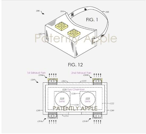 知情人士说,苹果还设计了带有风扇的头戴设备,这很反常,因为苹果通常在移动产品上尽量避免这种情况。苹果已经获得了两项热调节系统专利,都是为了HMD。下面是苹果HMD专利中的两张专利图。