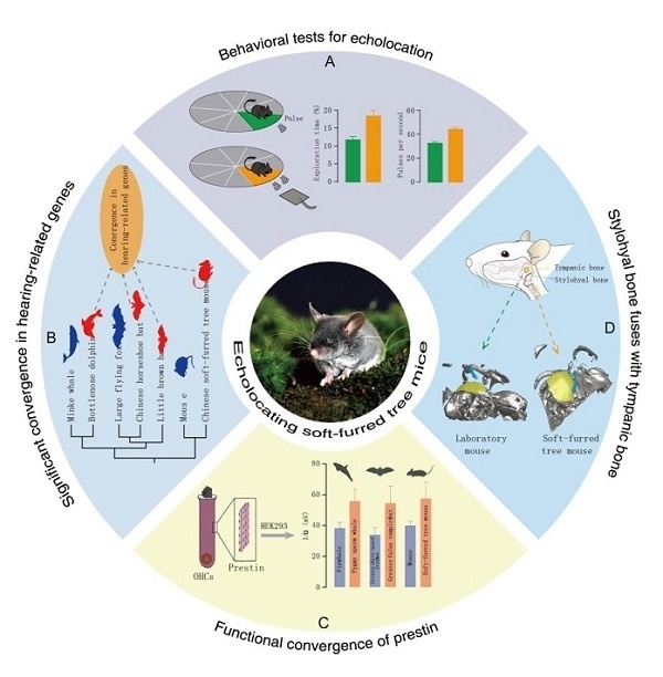 18日,中国科学院昆明动物研究所遗传资源与进化国家重点实验室施鹏课题组、蒋学龙课题组和刘振课题组联合通过整合行为学、解剖学、基因组学、以及基因功能实验多个独立的证据,证实了啮齿目猪尾鼠属(Typhlomys)的物种具有的回声定位能力。