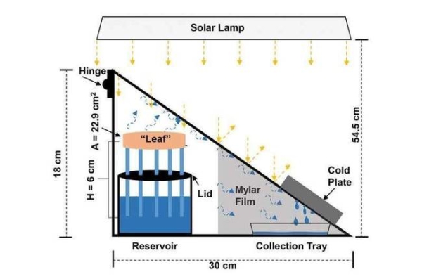 这棵合成树由19个管阵列组成,表面覆盖着充当“树叶”的纳米多孔陶瓷圆盘。每根塑料管模仿木质部导管形态,高6厘米,内径为3.175毫米。这种装置让蒸发界面与水箱中的重力水实现热分离,所以蒸发器并不会变得干燥。从圆盘上蒸发的水则借助吸力补充,吸力不断从底部水箱泵出更多水注入管阵列。