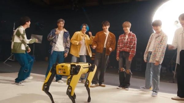 在第一个视频中,7个Spot机器狗在韩国流行音乐明星防弹少防弹团(BTS)的音乐伴奏下,一起跳着精心编排的舞蹈。第二段视频中,Spot机器狗更进一步,与防弹少防弹团斗舞,展示了它们精湛的舞蹈动作。