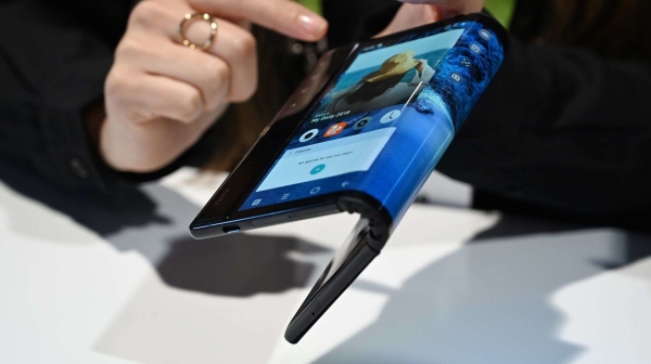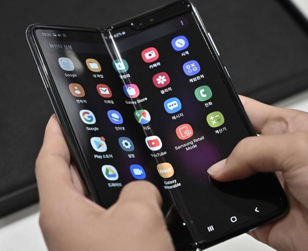 *致力于竞争:三星在2019年推出了自己的柔性显示屏手机系列。这里展示的是该公司的Galaxy Fold。图片来源: JUNG YEON-JE/AFP/GETTY IMAGES
