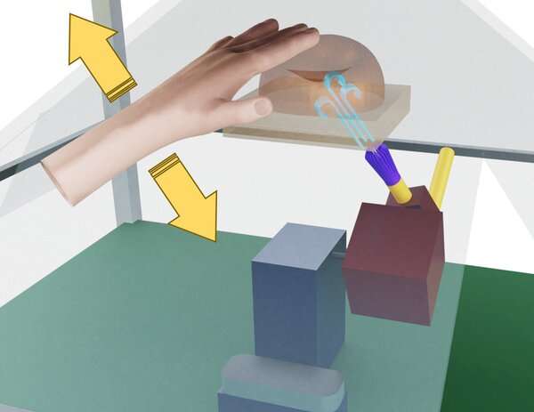 为了创造真实触感,研究人员将计算机生成的图形与精密控制的气流进行了配对,通过空气创造触觉反馈。用户将手伸进金字塔状的系统内,与电脑生成的物体互动。位于金字塔系统下方的传感器可以追踪用户的手和手指的运动,空气喷嘴将空气喷向用户,产生复杂的触觉。整个系统由电子硬件编程控制喷嘴的运动。研究人员还开发了一套算法,让空气喷嘴能够响应用户手的运动。