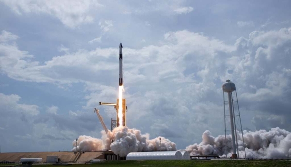 *搭载载人龙飞船示范2号(DM-2)的猎鹰9号运载火箭在肯尼迪航天中心发射台发射升空。图片来源:NASA/Bill Ingalls