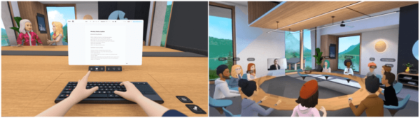与此同时,Facebook 的 Horizon Workrooms 与微软的 Mesh for Microsoft Teams 等新产品令在虚拟现实之中召开会议成为可能。虽然我还没用过微软的产品,但我发现 Horizon Workrooms 很吸引人的一点在于它对混合现实的管理方式:你不仅可以把你的计算机带进虚拟环境(通过在你计算机上运行的守护程序把屏幕投影到你的虚拟现实头显上),而没有佩戴虚拟现实头显的参会者只是出现在视频屏幕上,跟在物理世界中被召集到一起进行面对面会议的员工没有什么不同: