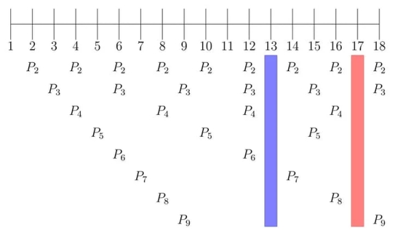 上图:P1-P9代表捕食者的生命周期。数字线代表年份。突出的间隔显示了13年和17年的蝉如何设法避开它们的捕食者。