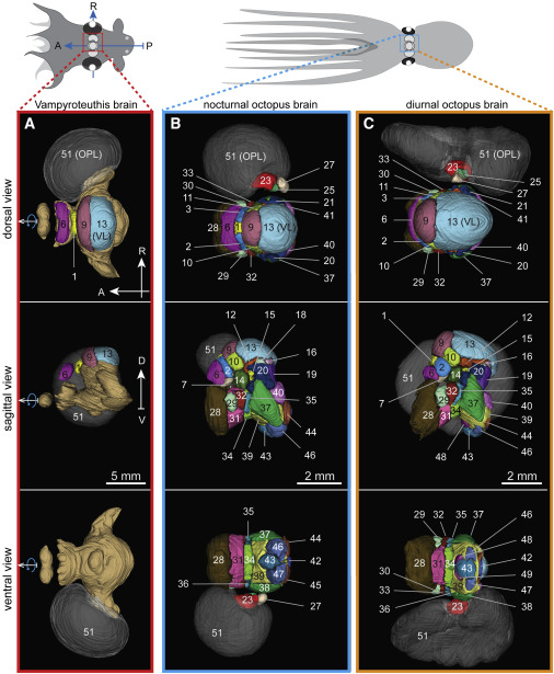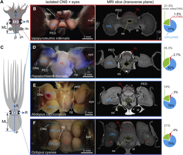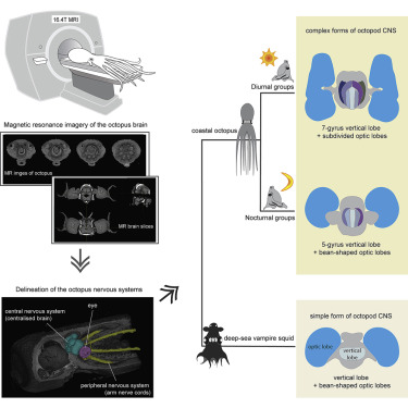 该研究团队使用MRI技术,研究了四种章鱼物种,以生成详细的3D图像,进一步比较它们独特的大脑结构。研究人员表示,章鱼的大脑各不相同,这取决于一个物种的栖息地、活跃时间以及是否与其他动物互动。