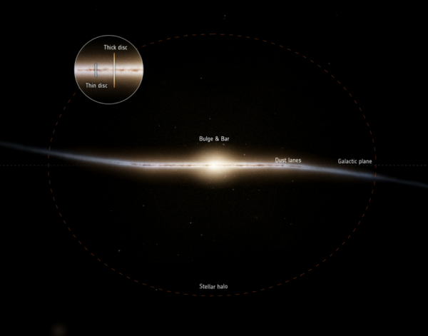 这个区域就是“厚盘”,它在宇宙大爆炸8亿年后才开始形成(译者注:厚盘被认为是星系早期运动和化学组成的证据来源,薄盘是某些星系的构成元件之一,1983年首次提出星系结构有薄盘、厚盘和星系晕等结构)。
