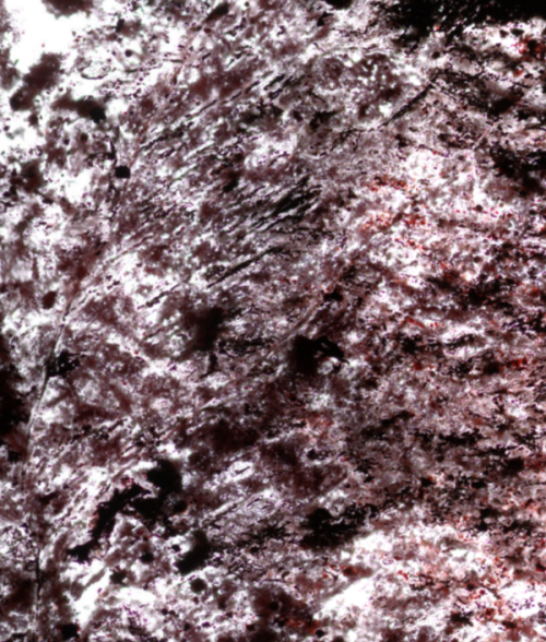 * 粉红色的岩石上,暗黑色的条纹和白色的线条贯穿其中。这里看到的细丝是茎状结构,表明了这是已知最古老的化石。